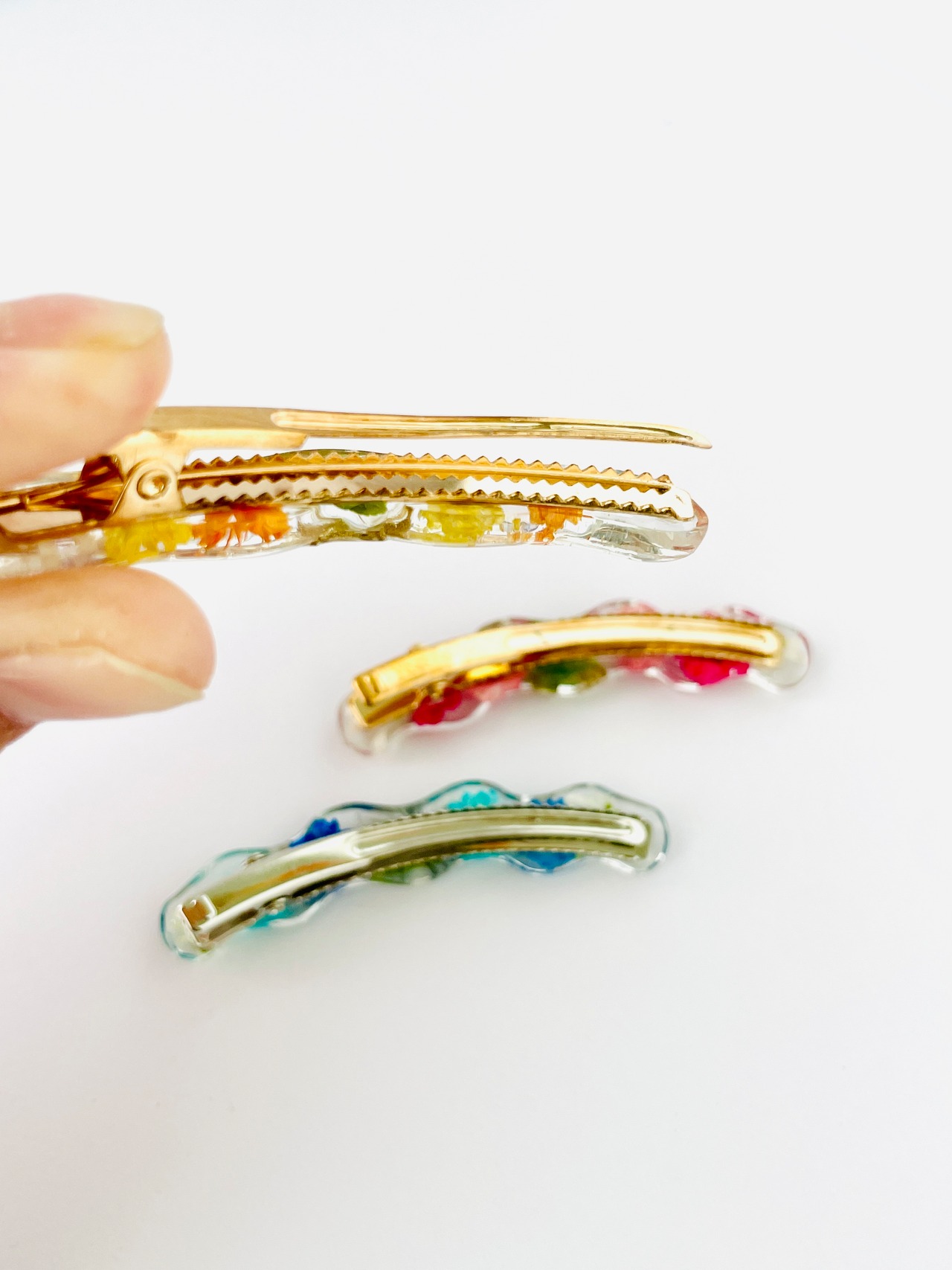 ハンドメイド アクセサリー おしゃれ 元気 ポップ 華やか 鮮やか 赤 レッド ブルー 青 黄色 オレンジ ピンク 水色 イエロー 軽やか 女性らしさ ナチュラル シンプル 美しい 透明感 特別な日 デイリー使い コーディネート 華やか カジュアル 夏 オールシーズン 誕生日 プレゼント ヘアアクセサリー ドライフラワー お出かけ ヘアアレンジ 簡単 クリップ ヘアピン コデマリ 八重咲コデマリ シルバー ゴールド 細長 カーブ ニュアンス 変形