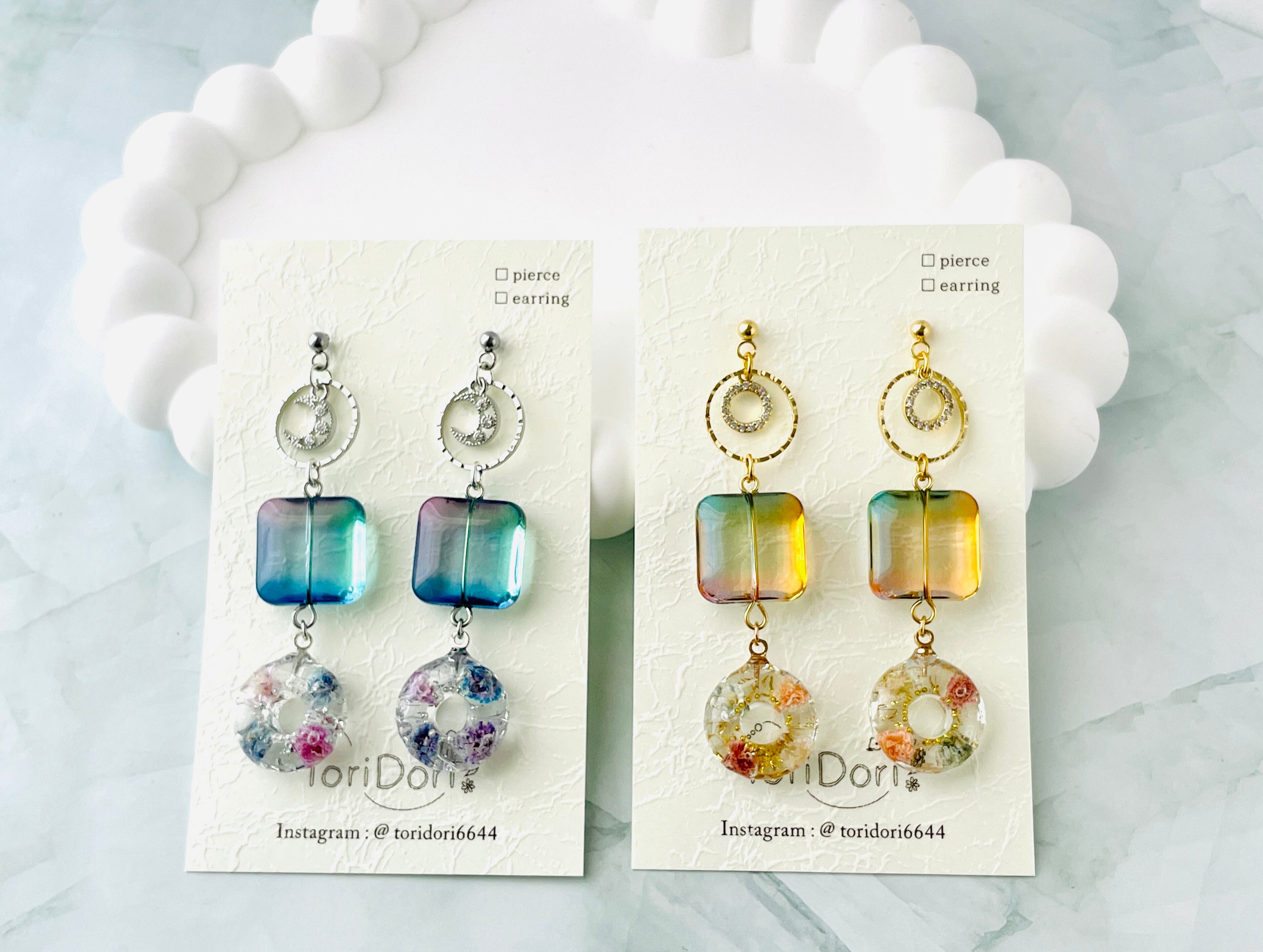 耳飾り ピアス イヤリング アクセサリー おしゃれ 上品 軽やか ハンドメイド デート 女性らしさ ナチュラル シンプル 美しい 透明感 特別な日 デイリー使い コーディネート 華やか 情景 清楚 女性らしさ ドライフラワー かすみそう かすみ草 カスミソウ かわいい お花 レジン ゆらゆら 揺れる おしゃれな耳飾り 上品 可愛らしい さり気ない 春 夏 秋 冬 鮮やか 色合い リング ドーナツ 四角 スクエア 丸 大人可愛い おとなかわいい クリア 空 グラデーション 太陽 デザイン クリップ式 蝶バネ式 青 ピンク オレンジ ゴールド 夕焼け色 夕 夕日 夕方 ジルコニア キュービックジルコニア サージカルステンレス