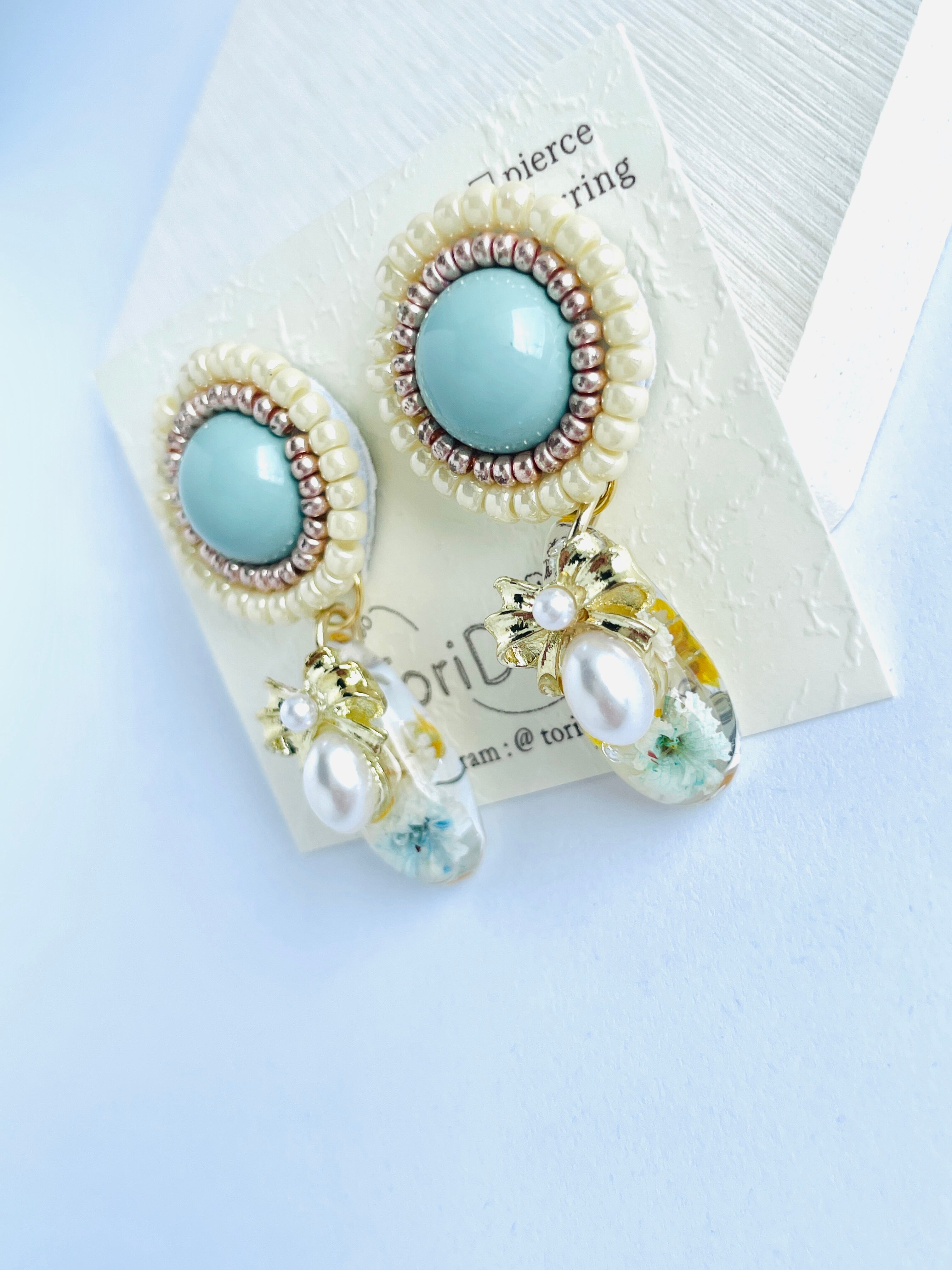 耳飾り ピアス イヤリング アクセサリー おしゃれ 上品 軽やか ハンドメイド デート 女性らしさ ナチュラル シンプル 美しい 透明感 特別な日 デイリー使い コーディネート 華やか カスミソウ ピーコックブルー ガーリー 清楚 優雅な耳飾り 上品 可愛らしい さり気ない 春 夏 冬 色合い 個性的 ドライフラワー ナチュラル 自然 透明感あふれる サージカルステンレス アクセント ブルー くすみカラー 透明感 クリア ホワイト 水色 青 揺れる ゴールド リボン りぼん パール 合皮 フェイクレザー