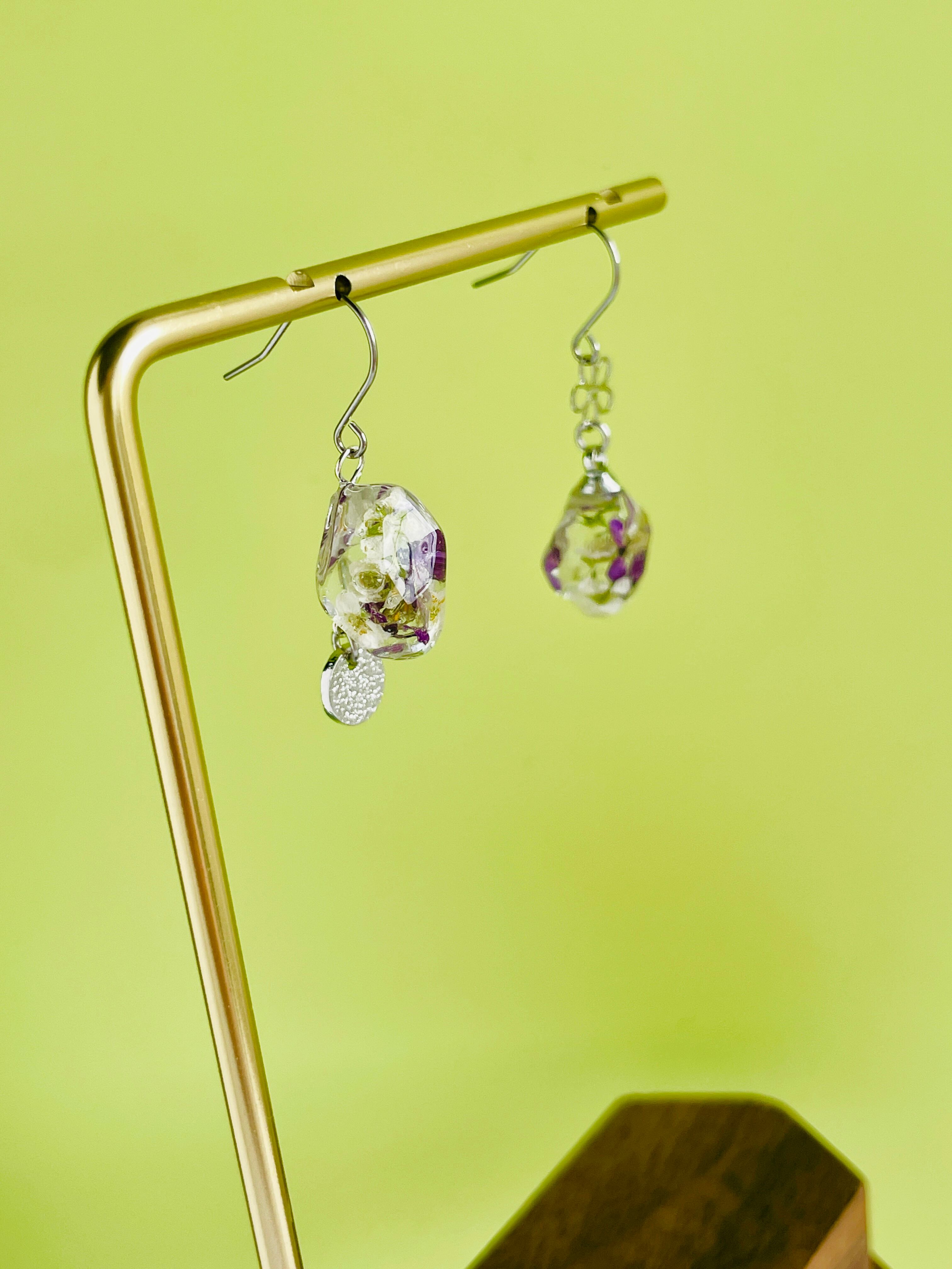 耳飾り ピアス イヤリング アクセサリー おしゃれ 上品 軽やか ハンドメイド デート 女性らしさ ナチュラル シンプル 美しい 透明感 特別な日 デイリー使い コーディネート 華やか アリッサム ゴールド 清楚 優雅な耳飾り 上品 可愛らしい さり気ない 春 夏 秋 冬 色合い 個性的 ドライフラワー ナチュラル 自然 透明感 サージカルステンレス アクセント アシンメトリー 揺れる デザイン アシメ 透明 フラワー 小花 オールシーズン 万能アイテム 華奢 クリア 鉱石 小石 左右非対称 ゴールド 金 シルバー 銀 紫 むらさき パープル 青紫 バイオレット ヴァイオレット 揺れる