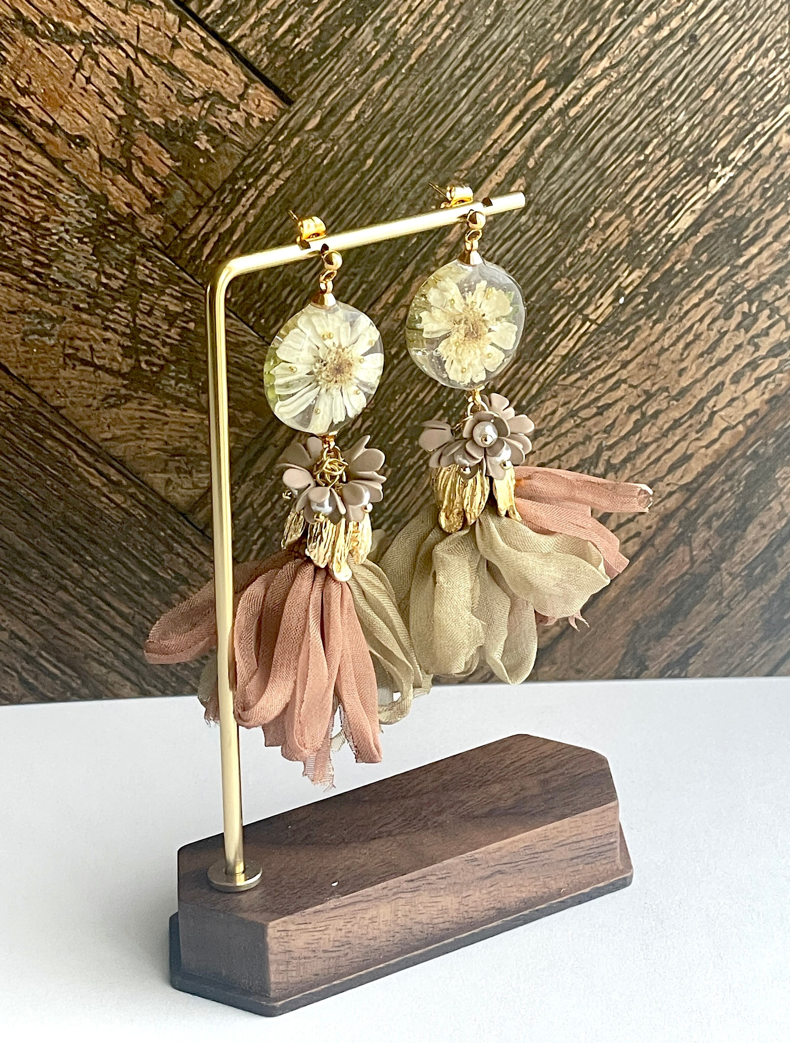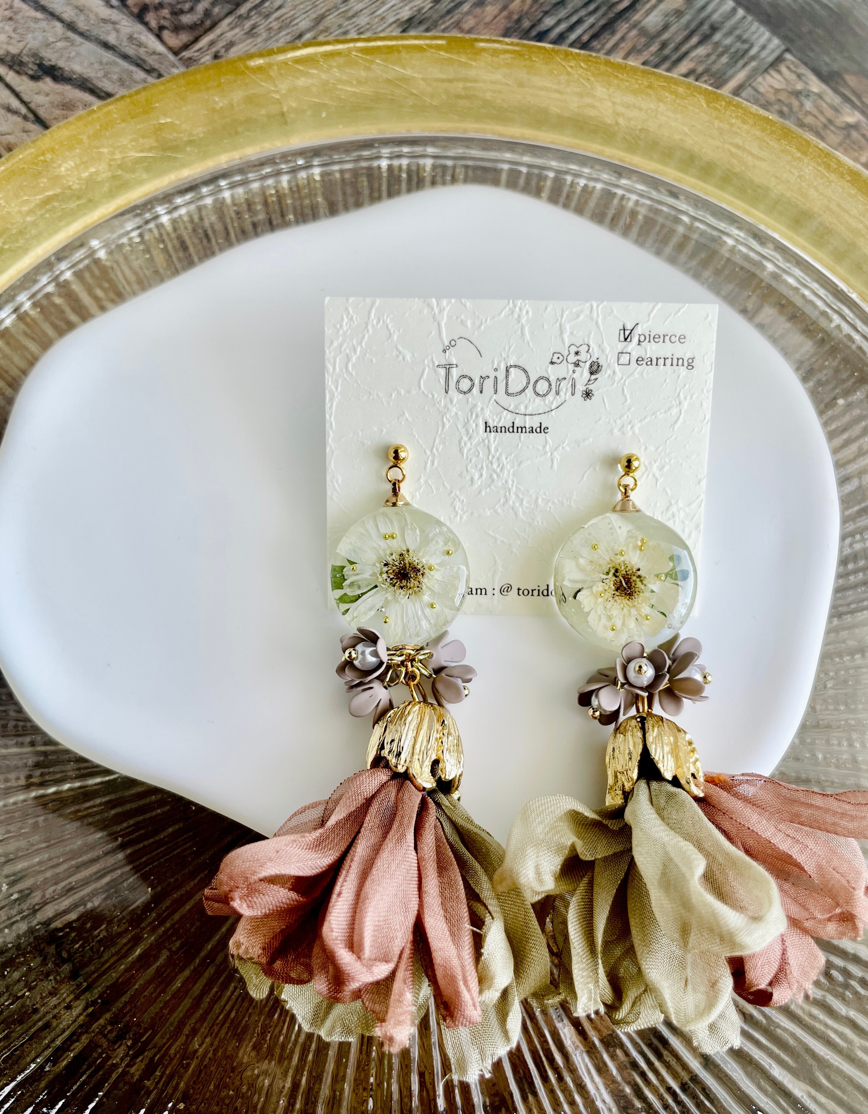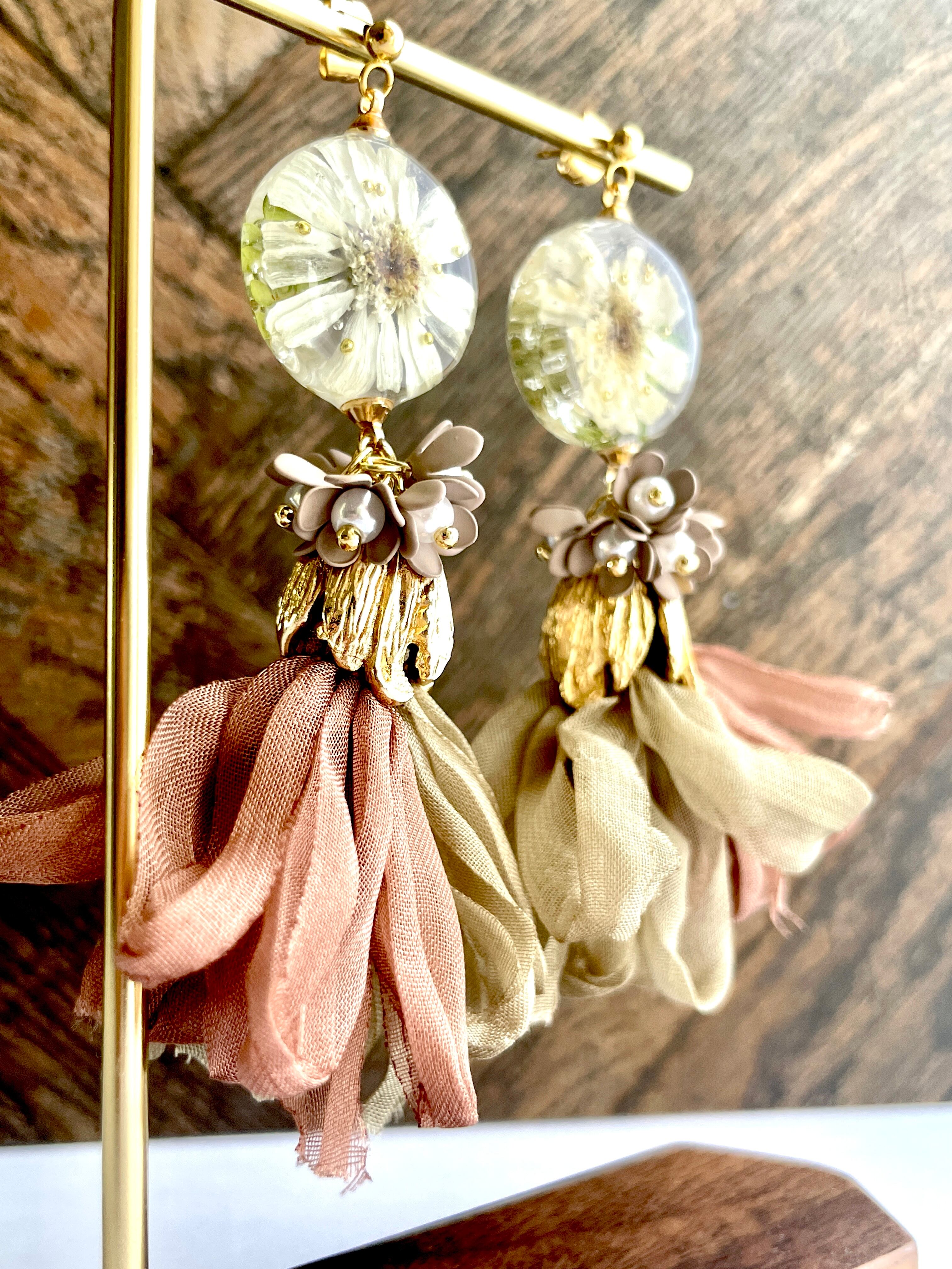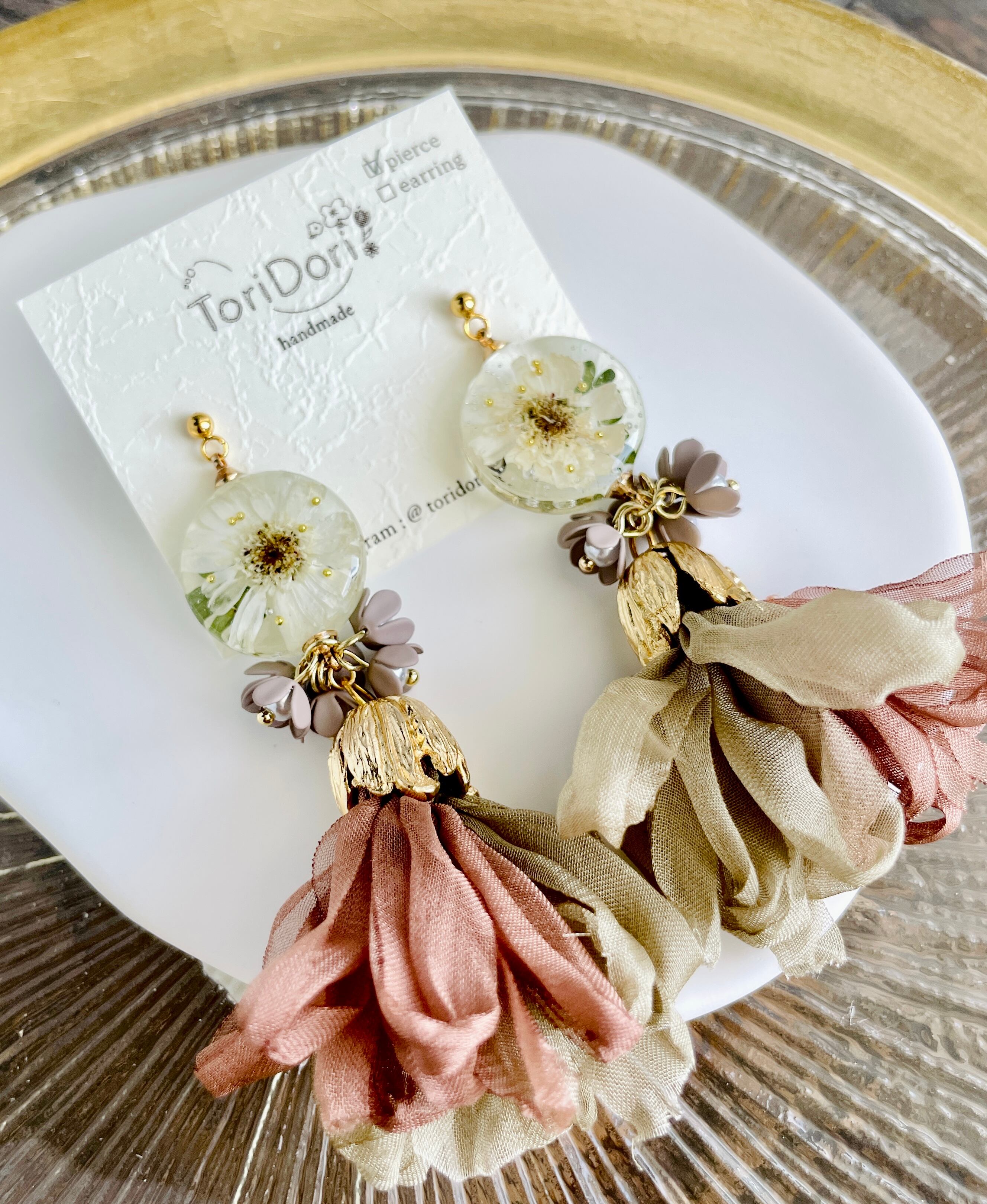 耳飾り ピアス イヤリング アクセサリー おしゃれ 可愛らしい ナチュラル シンプル 大振り 軽やか ハンドメイド デート 女性らしさ 透明感 特別な日 デイリー使い コーディネート 華やか タッセル マトリカリア ダブルラテ クール 優雅な耳飾り 上品 さり気ない 春 秋 冬 色合い 個性的 ナチュラル 自然 クリア 透明 サージカルステンレス アクセント デザイン 揺れる フラワー オールシーズン 万能アイテム 大人っぽい ウエディング パーティ 揺れる デザイン 小花 くすみカラー さわやか ダブル ラテ ピンク グリーン 緑 ゴールド ロングピアス 大ぶり リボン タッセル シフォン ドライフラワー