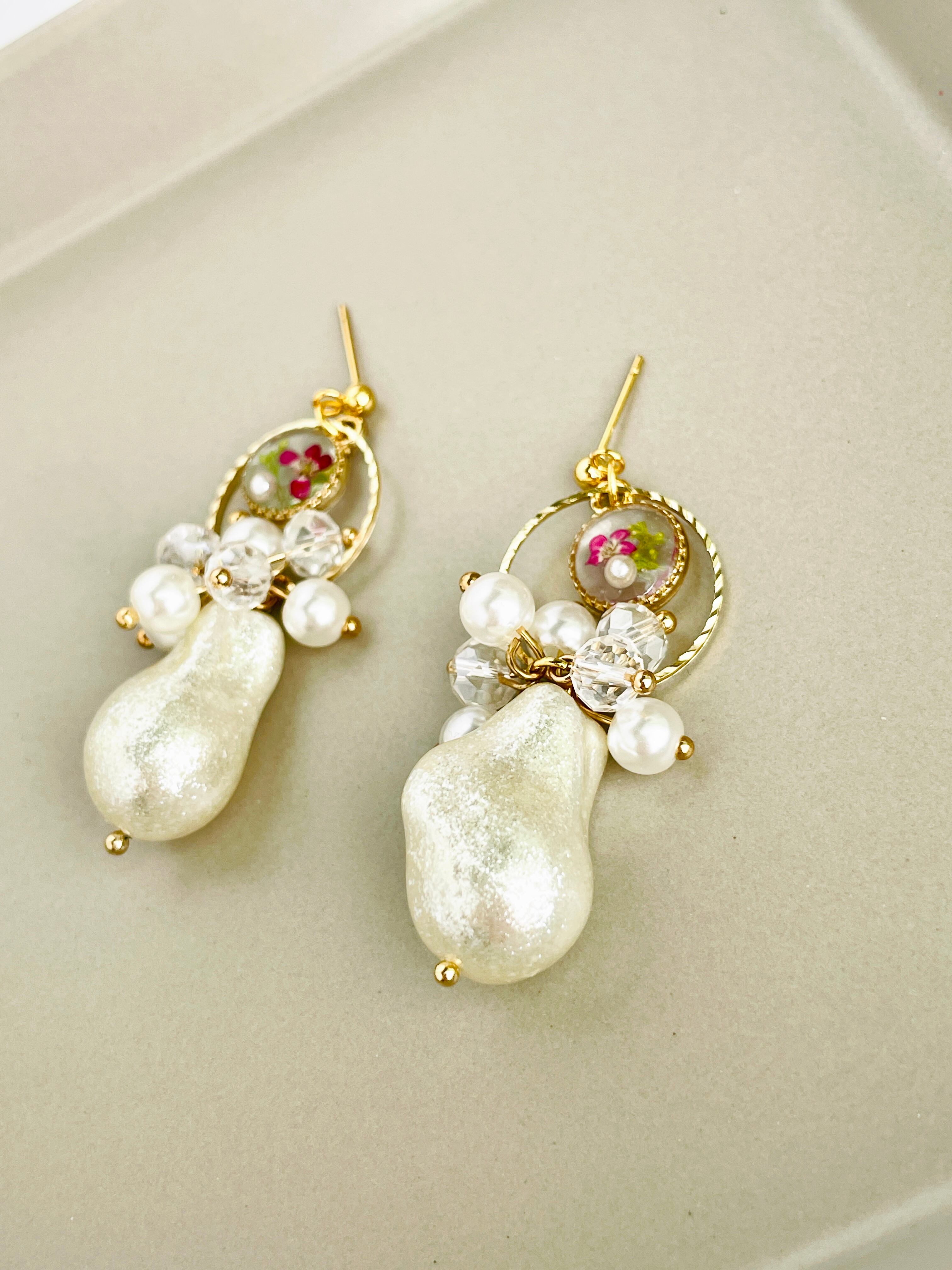 耳飾り ピアス イヤリング アクセサリー おしゃれ 可愛らしい ナチュラル シンプル 優しい 透明感 特別な日 デイリー使い コーディネート 華やか アリッサム 清楚 優雅な耳飾り 上品 さり気ない フラワー デザイン オールシーズン 大人かわいい 小花 ぷっくり 透明感 アクセント きれいめ クリア ゴールド ラメ ドレスアップ 特別な日 オールシーズン 白 ホワイト アイボリー 赤紫 赤 レッド パープル あかむらさき ありっさむ アリッサム ゴールド サークル じゃらじゃら 多角ビーズ 淡水パール 風