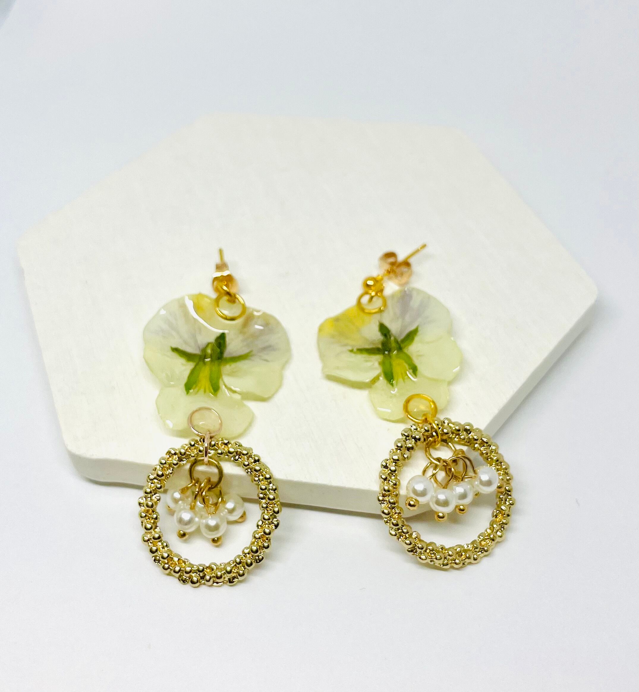 ビオラ(イエロー)とゴールドフープの耳飾り。
