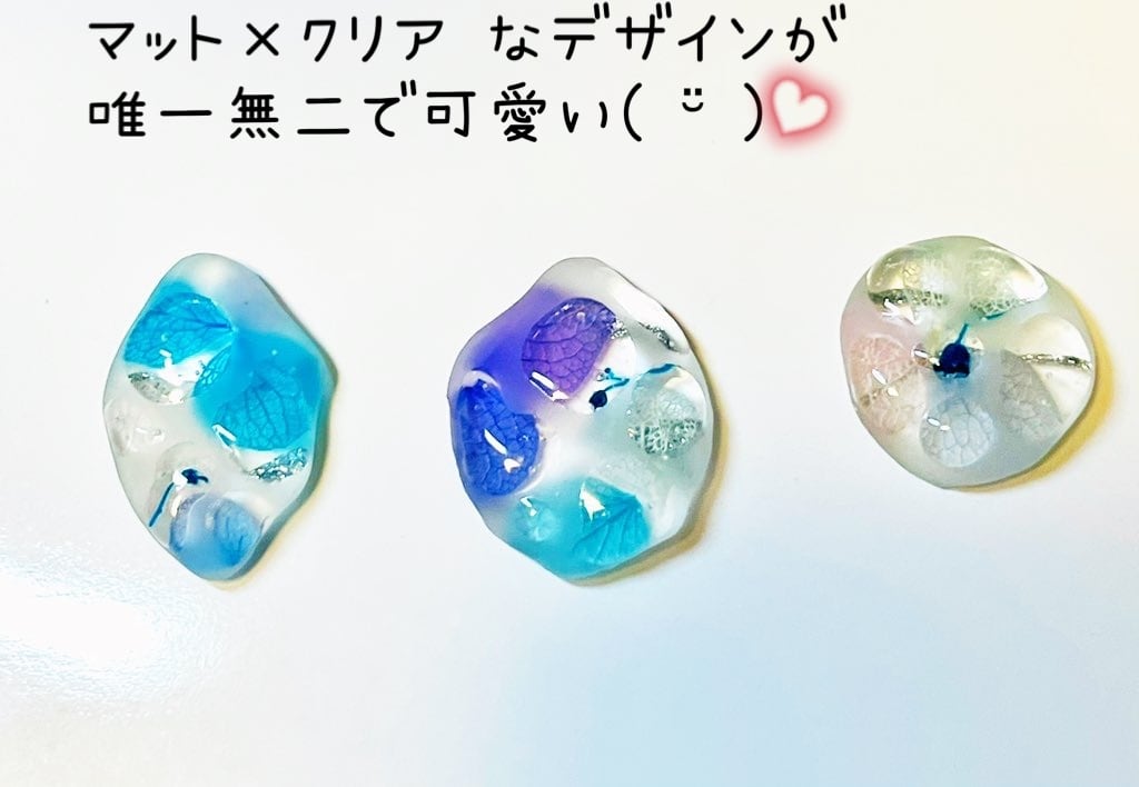 (商品画像はイメージです。ひとつずつ手作業で作成しており、紫陽花のガクの色合い・配置 クリア部分の模様は全て違います。ランダムでお届けいたしますので お届けまで楽しみにお待ちください。)