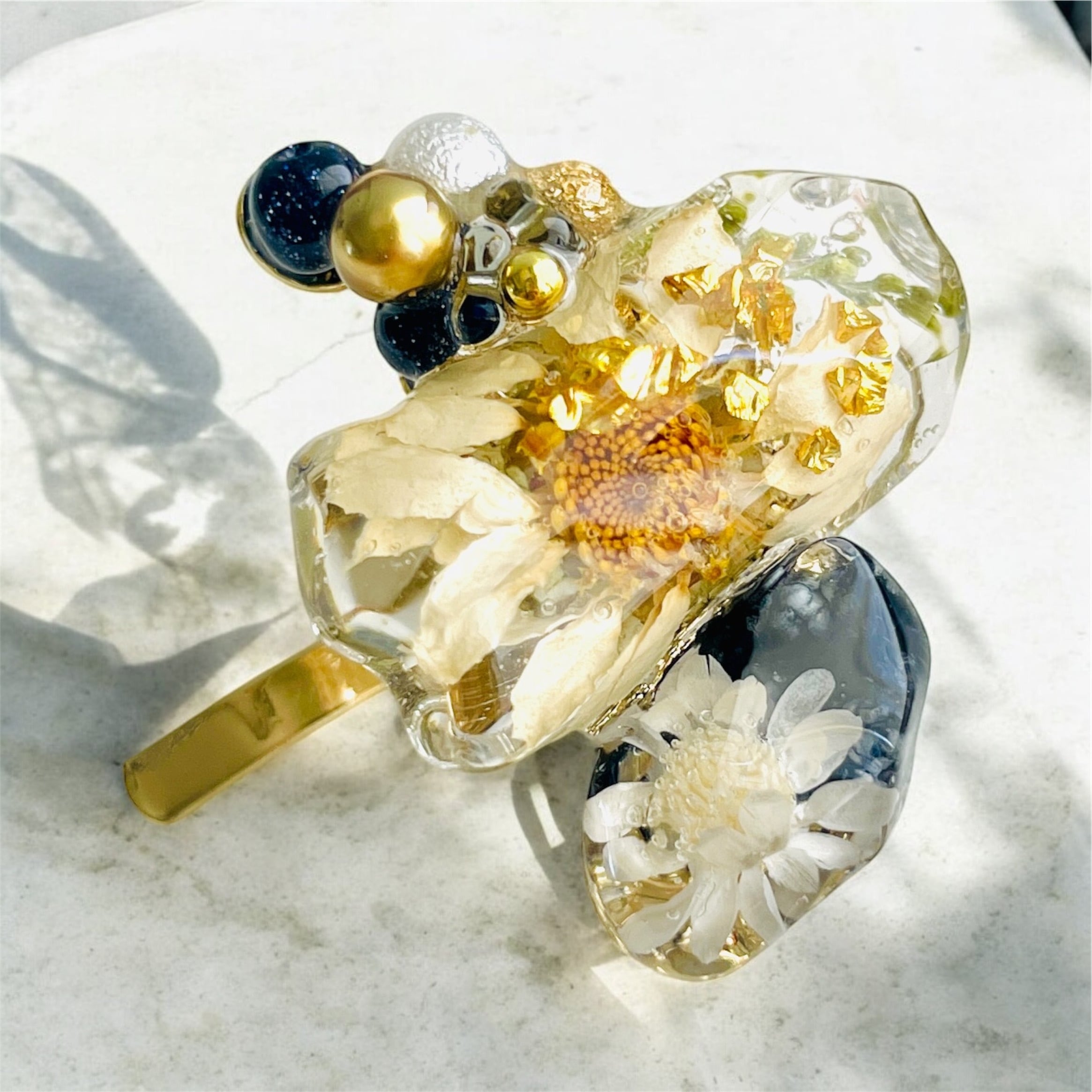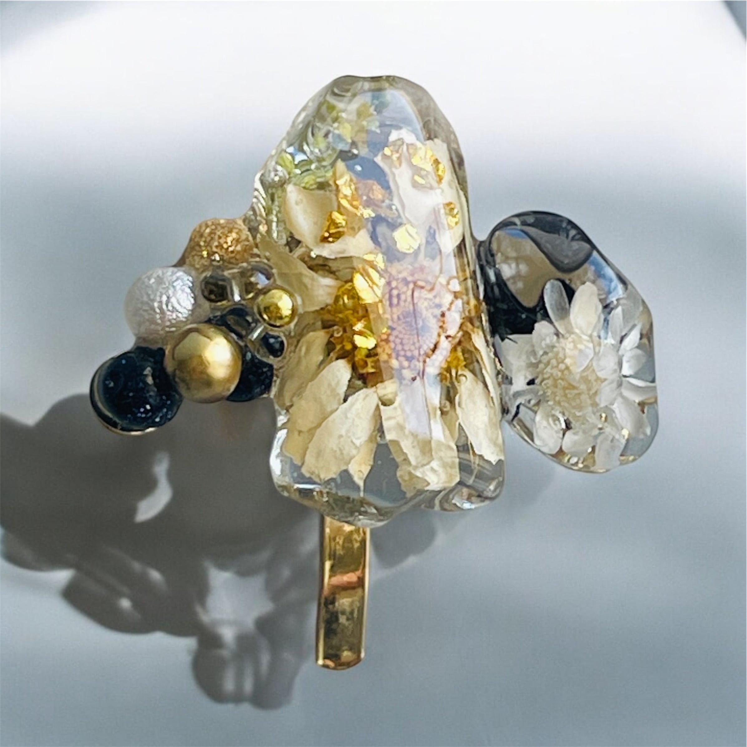 レジンの透明感と、ドライフラワーのアンティーク調の風合いが絶妙にマッチし、あなたのスタイルに上品な華やかさを添えます。